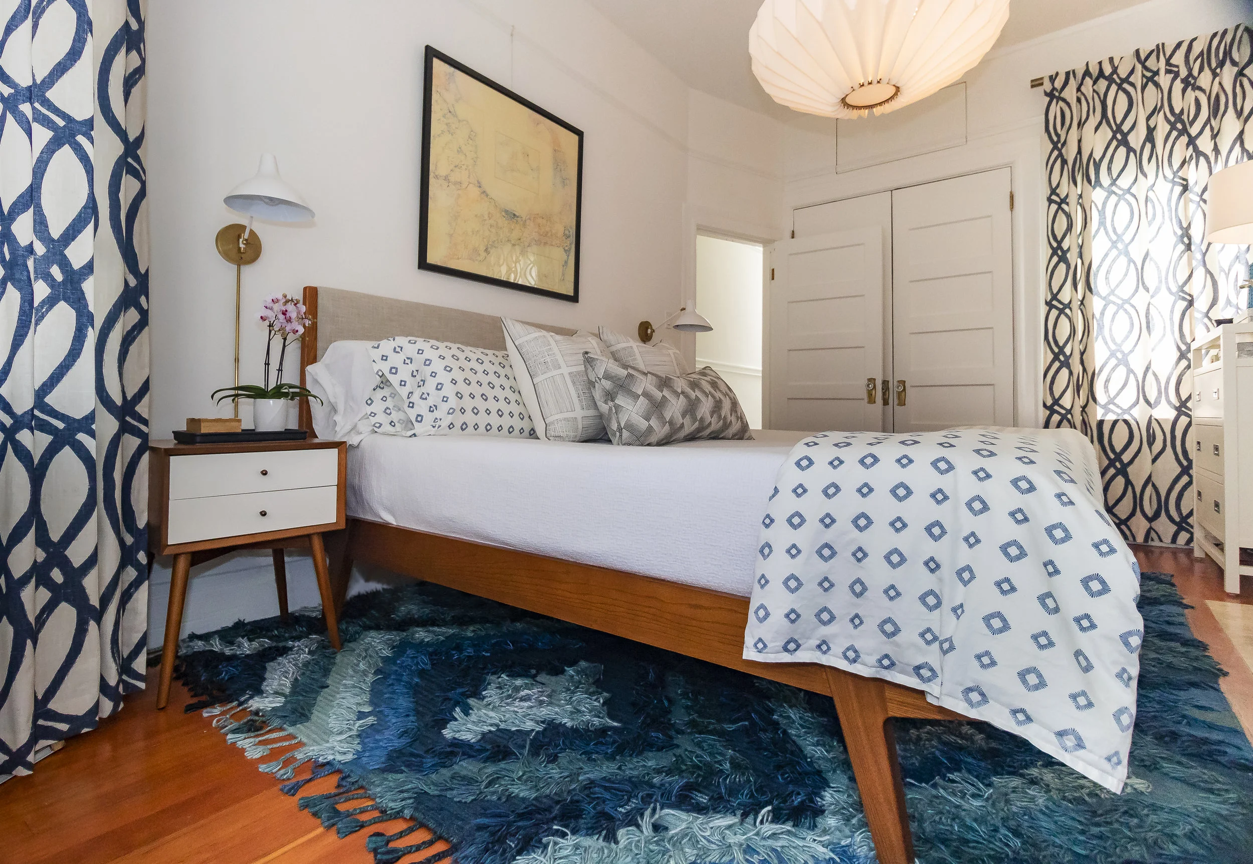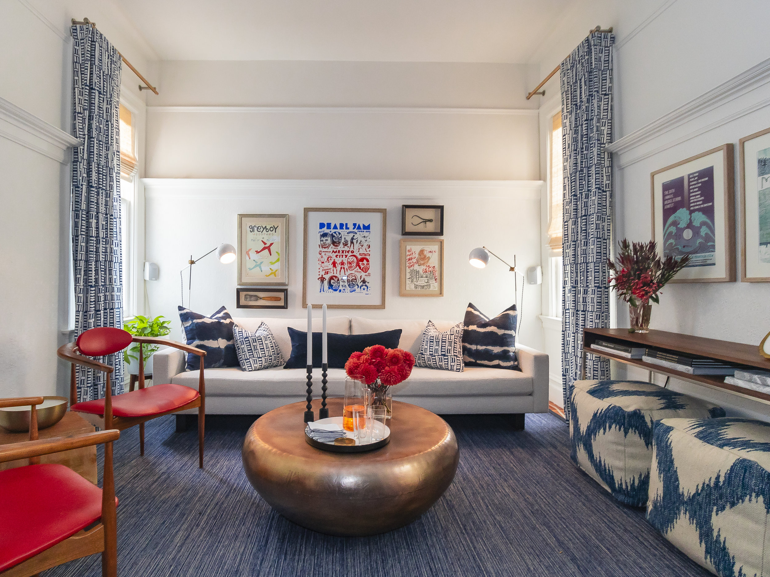 This client’s North Beach flat had lived a number of lives before we embarked on its refresh. Most recently, the unit was used as a vacation rental, and the furnishings were hard wearing and rental friendly. We transformed this petite pad into a unique space with personality and a thoughtful furniture plan. The new design created a beautiful backdrop for the owners’ extensive concert art collection. We’re big fans of this practical and whimsical new home.